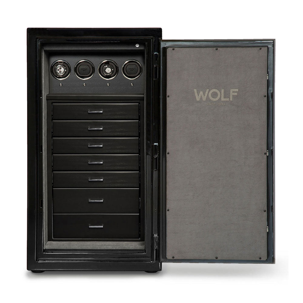 The ultimate in security for your watches, jewelry & valuables. Bespoke, the Atlas safe can be configured for as many winders and drawers as you need. Forged in American steel, UL tested and certified for burglary & fire, the Atlas is an impenetrable fortress. Painted steel polished to a mirror finish, drawers lined with LusterLoc™ treated fabrics that stop tarnishing for 35 years. Watch winders are controlled by WOLF’s Bluetooth connected App. Control one or all winders at the same time.