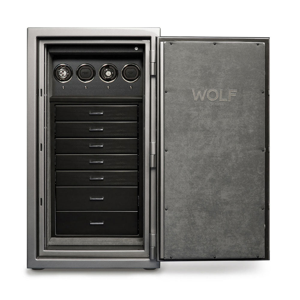 The ultimate in security for your watches, jewelry & valuables. Bespoke, the Atlas safe can be configured for as many winders and drawers as you need. Forged in American steel, UL tested and certified for burglary & fire, the Atlas is an impenetrable fortress. Painted steel polished to a mirror finish, drawers lined with LusterLoc™ treated fabrics that stop tarnishing for 35 years. Watch winders are controlled by WOLF’s Bluetooth connected App. Control one or all winders at the same time.