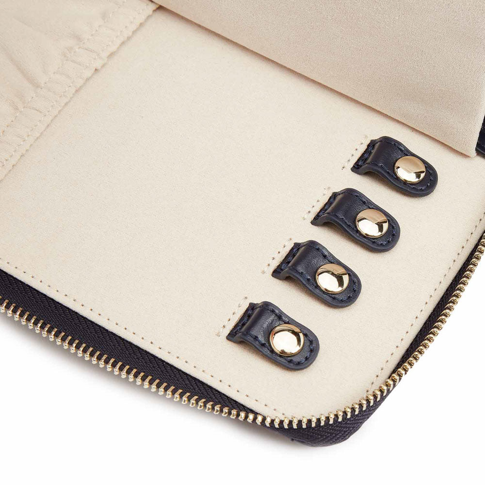 Short Description Storage: 1 earring tab, 1 ring tab, 2 zip compartments, 4 snap-on necklace hooks with pocket
